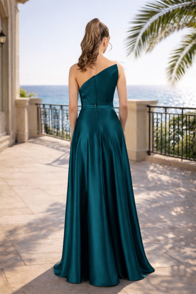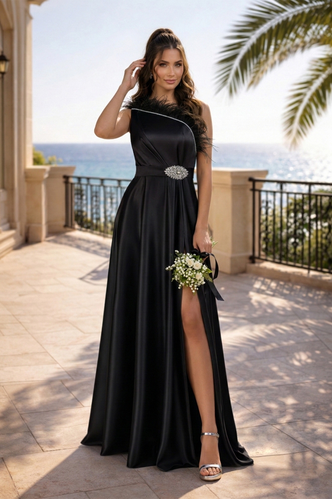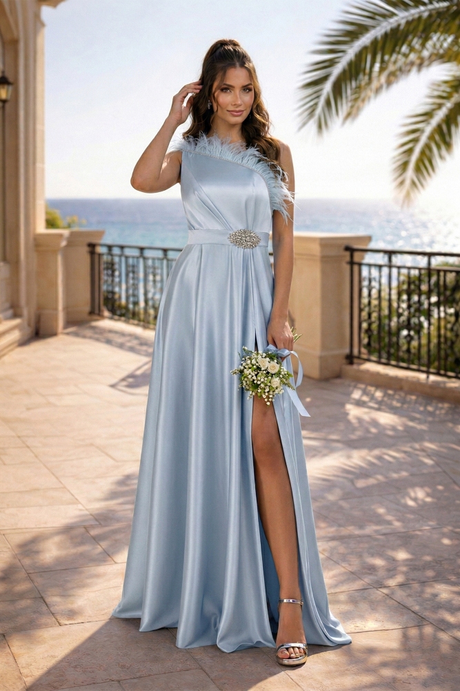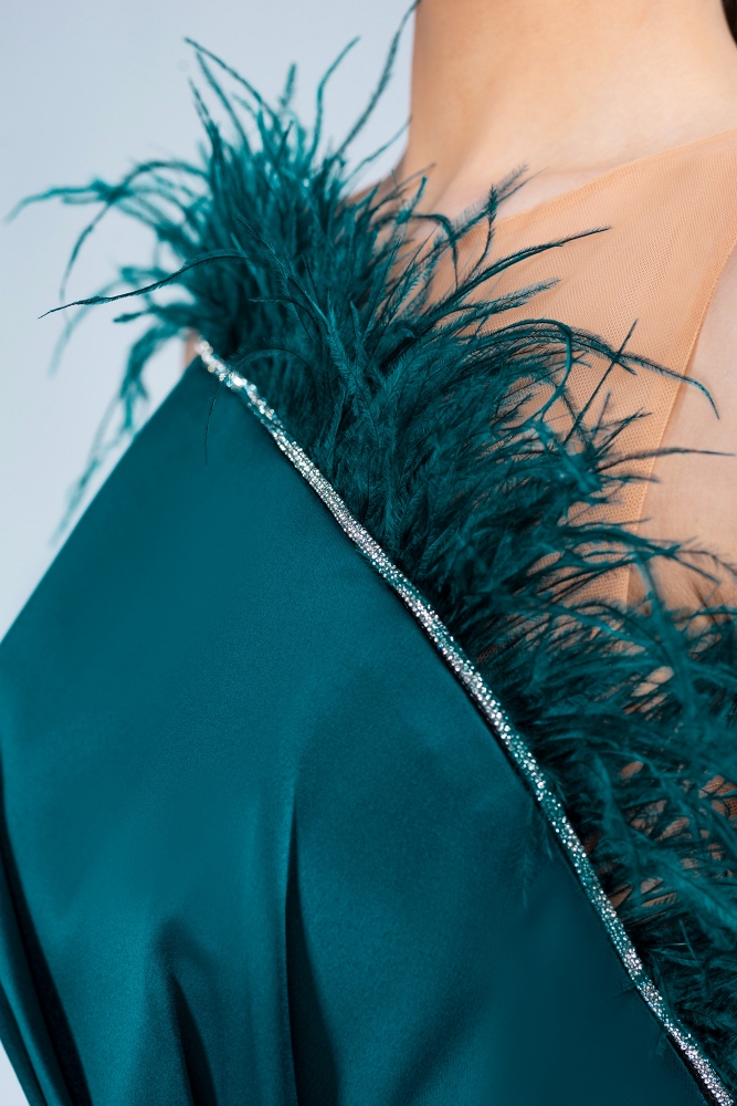 Material: tafetán elástico, tul nude Forro: milanés Cierre con cremallera en la parte posterior Cinturón desmontable, decorado con accesorio con cristales Plumas decorativas en la zona del busto