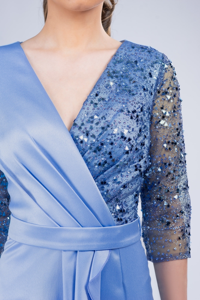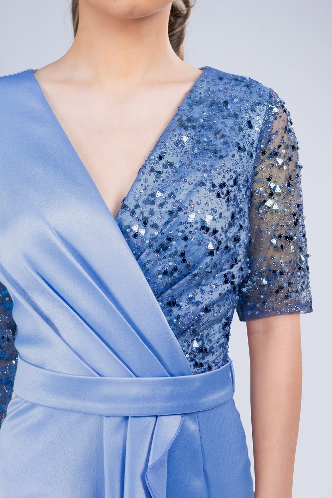 Materiales: encaje con perlas, lentejuelas y purpurina, tafetán elástico
