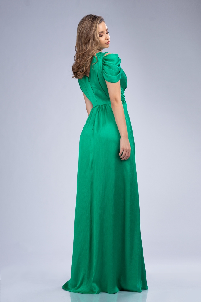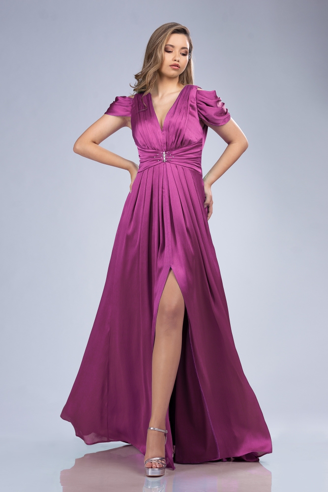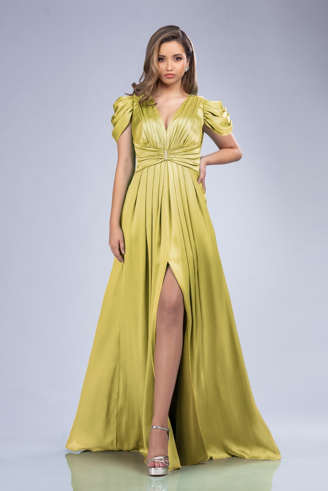 Este vestido de noche forma parte de nuestra colección de vestidos al por mayor y está confeccionado en gasa satinada, un tejido fluido con brillo elegante, perfecto para ocasiones especiales. El interior está acabado con forro de milanés, garantizando comodidad y un ajuste impecable al cuerpo.