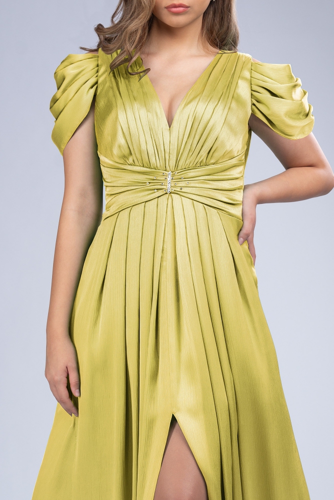 El diseño presenta mangas cortas abullonadas con pliegues delicados y un escote en V que realza la línea del cuello. La cintura está adornada con un accesorio fino con cristales, que aporta un toque extra de elegancia.