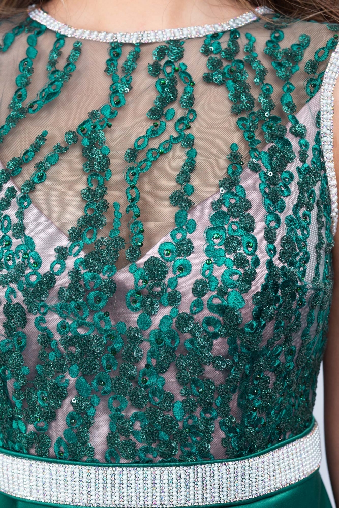 - Materiales: encaje con lentejuelas, tafetán